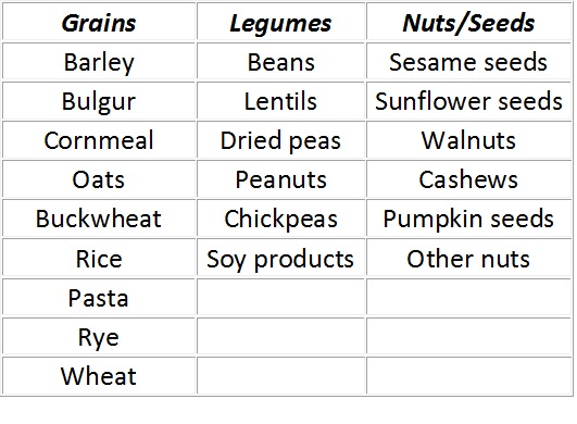 Even though vegetable proteins (grains, legumes, nuts, seeds, and other vegetables) are incomplete proteins, they are rich in complex carbohydrate and fiber and they are in fact an excellent source of protein. By combining foods from two or more of the following columns, you create a self-made complete protein. You see, the foods in one column may be missing amino acids that are present in the foods listed in another column. When eaten in combination at the same meal (or separately throughout the day), your body receives all nine essential amino acids.
